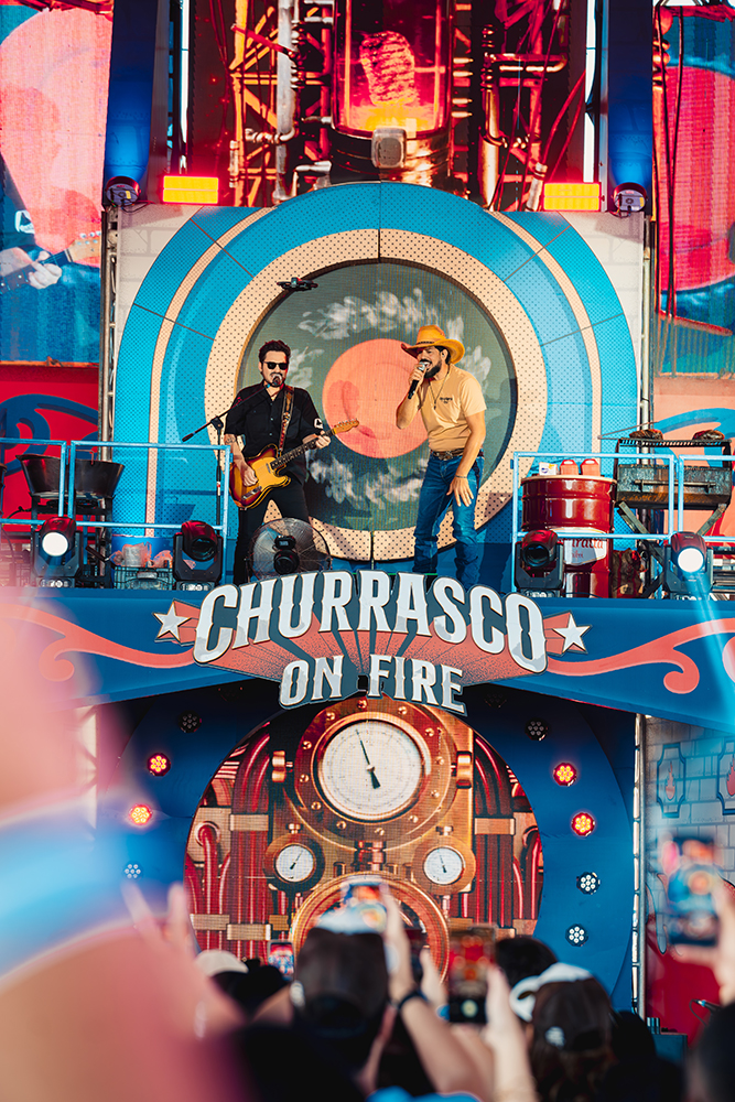 Na parte musical, o espetáculo também foge do formato tradicional e inova. O Churrasco On Fire conta com um palco itinerante considerado o maior da América Latina, formado por 12 espaços distribuídos pelo evento. Durante o show, Fernando e Sorocaba circulam por diferentes pontos da estrutura, criando proximidade com o público e transformando a apresentação em uma experiência dinâmica.
