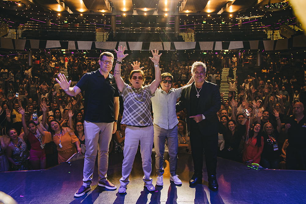 A festa começou no sábado (15), com a chegada de Chitãozinho & Xororó ao navio. Recebidos pelo apresentador Eri Johnson, marinheiros e representantes da PromoAção, fizeram um brinde que deu o tom da celebração da estreia. No átrio, o público formou um grande coro com “Evidências”, transformando o embarque na primeira demonstração da energia que acompanharia a dupla durante toda a experiência. O momento também ganhou simbolismo com a homenagem da confeiteira Beca Milano, que apresentou um bolo de mais de um metro com elementos clássicos da trajetória dos anfitriões.