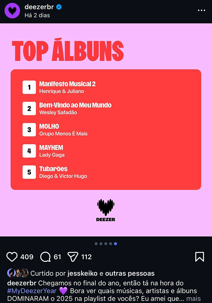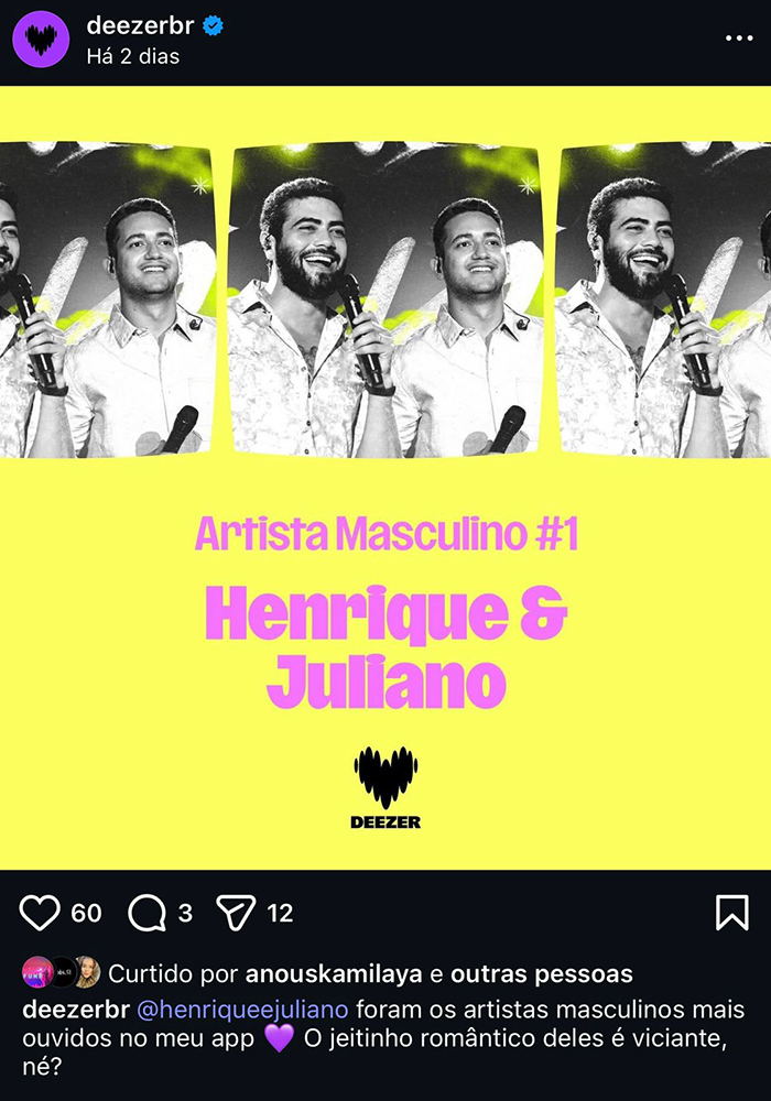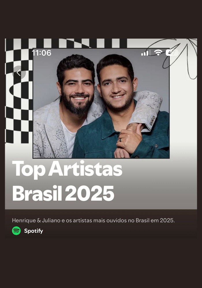 Henrique & Juliano se consolidam como um dos maiores nomes da música sertaneja, pelo segundo ano consecutivo a dupla emplacou o “Manifesto Musical 2” como o álbum mais ouvido do Spotify, além de adicionarem “O Céu Explica Tudo” e “To Be” entre os cinco mais ouvidos. Tal feito, levou a dupla a alcançar a liderança do ranking de artistas mais ouvidos do Spotify Brasil em 2025.